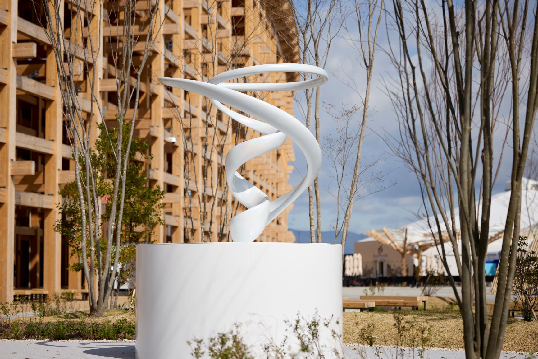 Made of intricately connected aluminum elements, the sculpture’s complex yet delicate structure seems to flow and expand. Its surface is coated with a pearlescent finish, reflecting light to enhance its dynamic presence and sense of perpetual motion.