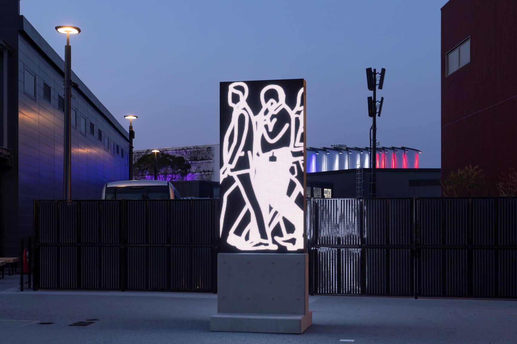 Using anonymous pedestrians as models, the artist employs a visual language that is simple yet remarkably attentive to detail, capturing the vibrancy of urban life. By adopting the LED display as an artistic medium, the work acts as a mirror to the urban scene, turning the public into a monument.