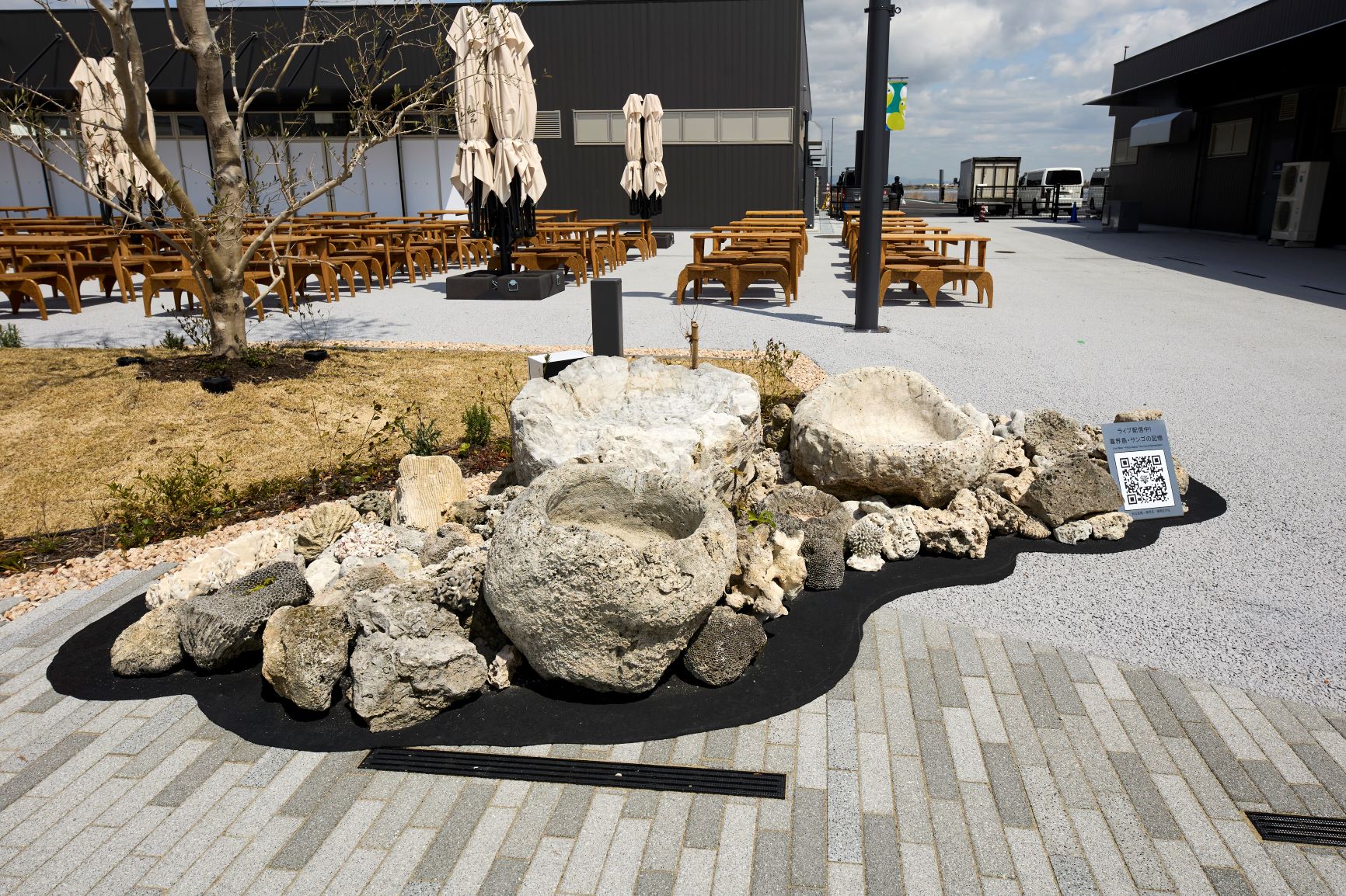 サンゴ礁が隆起してできた奇跡の島・喜界島。サンゴの化石は地球環境の変化を記憶しています。喜界島の巨大なサンゴ石をくり抜いて作られた伝統的な芋洗い鉢、トーニ/フムラーと全集落のサンゴ石を重ねたサウンド&ビジュアルインスタレーション。喜界島の「今」をリアルタイム音声と映像で会場につなぎ、島の息吹を感じる空間を生み出します。来場者はQRコードをスマートフォンで読み取り、島のライブ映像と海水温度のリアルタイム変化や過去からの推移を視覚的に確認できます。触覚・聴覚・視覚の体験を通じて、気候変動や環境問題を身近に感じ、地域と世界を繋ぐ共感の輪を広げることを目指します。