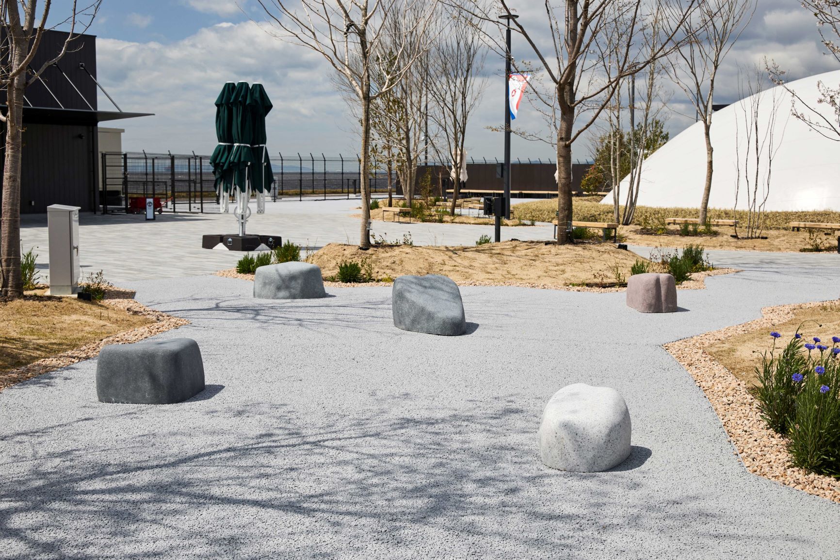 ハートをイメージする石の彫刻を5つ配置。5つの石は世界の五大陸(アメリカ・ヨーロッパ・アフリカ・アジア・オセアニア)から掘り出された石を使用します。それらの石をひとつの空間に配置することで、地球はひとつであることを意味します。その石を万博に訪れる世界中の人たちが一緒になり磨くことで国や文化を超えた人類の普遍的な願いである「愛」と「平和」を表現したいと思います。世界中の人が力を合わせて磨いた石は永遠に輝き続け未来へのEXPO2025の記憶となります。